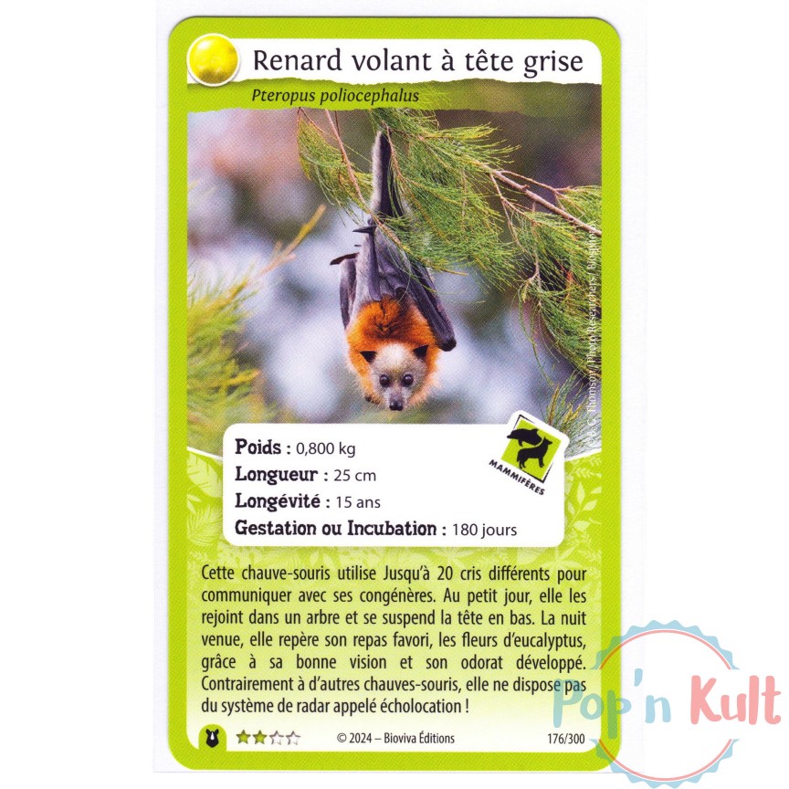 Carte Défis Nature Protect 176/300 Renard volant à tête grise ★★ [FR] Forces de la Nature Near Mint